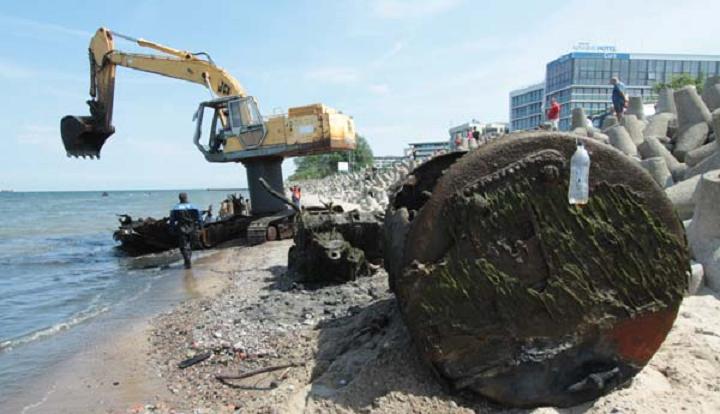 Wrak stuletniego parowca – holownika wydobyła z morza na kołobrzeskiej plaży firma saperska. Parowiec, który  tkwił w mule pod wodą, został wyciągnięty na brzeg podczas prac związanych z umocnieniem brzegu.