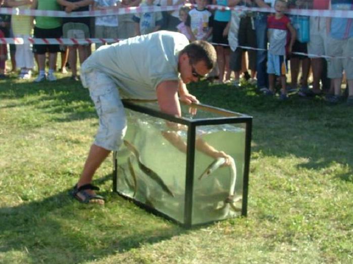 Chodzi o część festynu, podczas której mieszkańcy i turyści rękoma łapią węgorze pływające w  specjalnym akwarium.