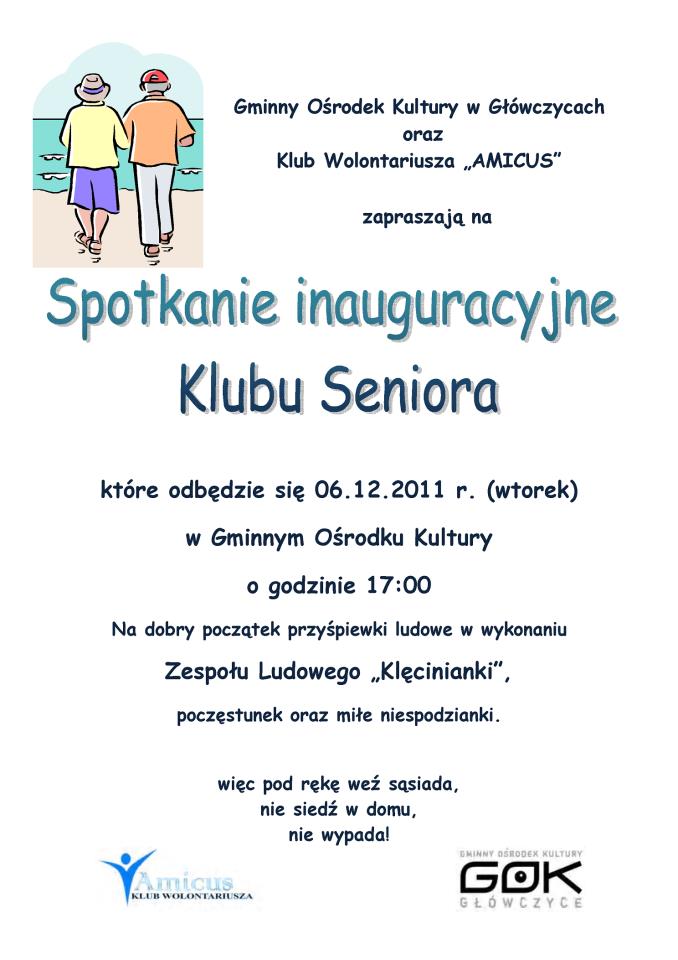 6 grudnia 2011 roku, o godz. 17 w Gminnym Ośrodku Kultury w Główczycach rozpoczyna działalność Klub Seniora. – Zapraszamy zarówno starszych jak i tych w sile wieku, którzy chcieliby razem z nami tworzyć miejsce ciekawych inicjatyw i wspólnego spędzania czasu – mówią organizatorzy.