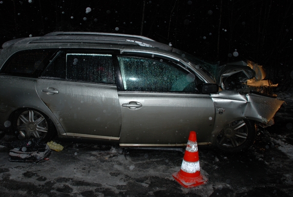 W niedzielę przed godz. 19:00 lęborska policja została powiadomiona o wypadku drogowym na drodze 214 z Lęborka do Cewic. Na miejsce skierowano patrol drogówki oraz służby ratunkowe. Dojazd do miejsca wypadku utrudniały warunki pogodowe spowodowane silnymi opadami mokrego śniegu. Jak wstępnie ustalono osobowa toyota kierowana przez 33 letniego mężczyznę zjechała na lewy pas jezdni a następnie uderzyła w drzewo. W wyniku wypadku ranni zostali wszyscy jadący samochodem w tym dwoje dzieci w wieku 14 i 3 lat. Najciężej ranną, z poważnymi obrażeniami głowy, 14 latkę oraz 3 letnią dziewczynkę przewieziono do szpitala w Słupsku. Pozostałe osoby pozostały w szpitalu w Lęborku.