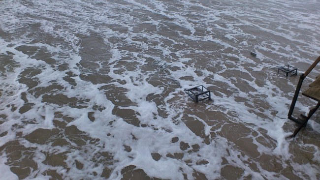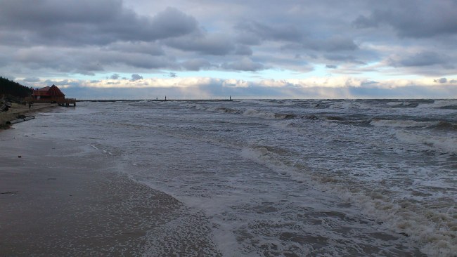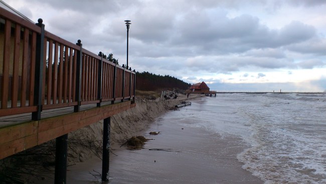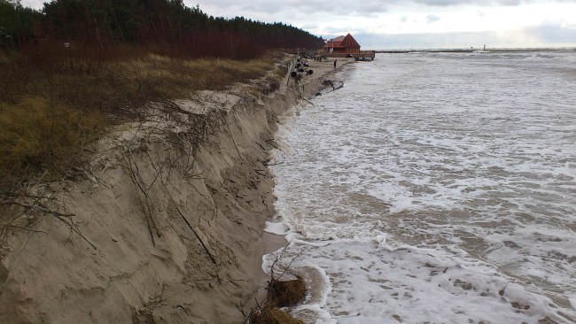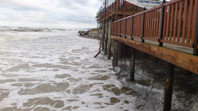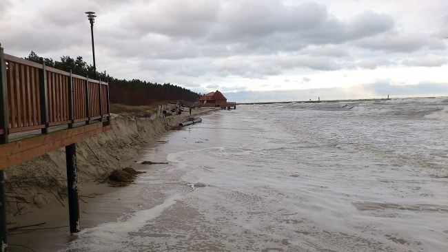 Spacerowicze muszą zapomnieć na jakiś czas o przechadzce plażą w Łebie, która została niemal całkowicie zalana przez wody Bałtyku. Niespokojne morze wdziera się w głąb lądu, zabierając z brzegu tony piasku. Mieszkańcy obawiają się podtopień.