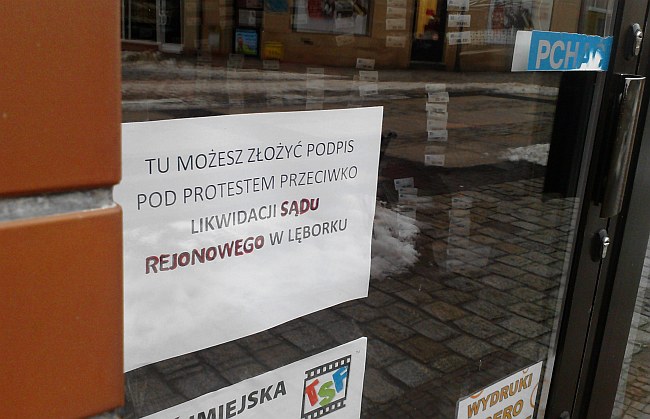 Listy, na których można złożyć podpis wyrażający protest przeciwko likwidacji sądu wyłożono w ponad 70 sklepach na terenie całego miasta. Akcję pilotują radny powiatowy Edmund Głombiewski i miejski Zbigniew Rudyk. Mają nadzieję, że sprzeciw społeczny przemówi do rozsądku rządu, który dba o swój wizerunek i będzie chciał uniknąć konfrontacji z mieszkańcami Lęborka. Do tej pory udało się zebrać prawie półtora tysiąca podpisów.