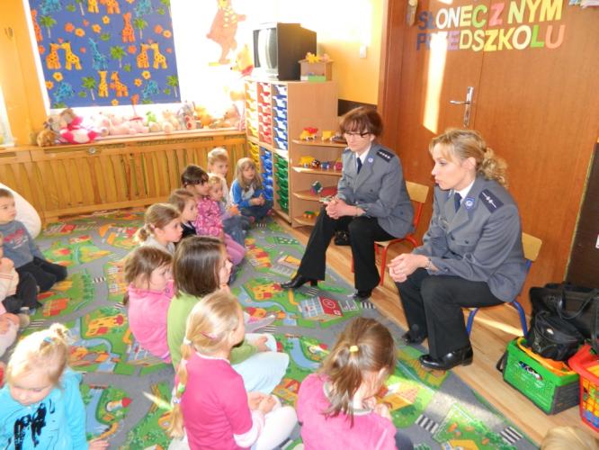 Na spotkaniu z policjantkami przedszkolaki dowiedziały się o zasadach bezpieczeństwa podczas wypoczynku, jak bezpiecznie przechodzić przez jezdnię, jak się zachowywać na drodze i jak przechodzić na drugą stronę ulicy. Oprócz tego funkcjonariuszki omówiły bezpieczne zabawy w domu i na podwórku, co należy zrobić w przypadku, gdy zaczepia nas osoba obca. Ponadto omówiły zasady bezpiecznych zabaw na śniegu. Dodatkowo policjantki przestrzegały dzieci przed zabawą na zamarzniętych sadzawkach, jeziorach i stawach a także o tym, że nie wolno jeździć na sankach ciągniętych przez samochód, gdyż takie zabawy są bardzo niebezpieczne. Na koniec mundurowe czytały przedszkolakom bajki w ramach akcji „Cała Polska Czyta Dzieciom”.