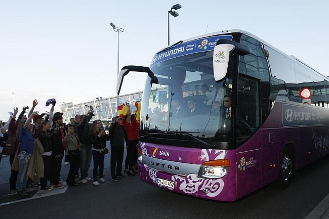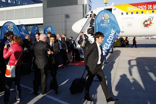 Reprezentacja Hiszpanii w piłce nożnej jest już w Polsce. Piłkarze wylądowali we wtorek wieczorem na lotnisku im. Lecha Wałęsy w Rębiechowie, skąd autokarem udali się do Gniewina, gdzie powitały ich setki kibiców.