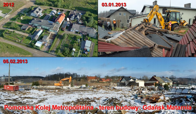 Od początku 2013 roku prowadzone są pierwsze prace związane z realizacją projektu Pomorskiej Kolei Metropolitalnej. Od 3 stycznia trwają rozbiórki budynków zlokalizowanych na trasie PKM, natomiast 9 stycznia rozpoczęła się wycinka drzew stojących w pasie kolejowym. Pierwsze budynki gospodarcze stojące na trasie PKM już zostały rozebrane, natomiast w budynkach mieszkalnych trwa demontaż elementów do odzysku i utylizacji. Pierwsze z nich zostały już oczyszczone i czekają na wyburzenie. – informuje spółka PKM S.A.