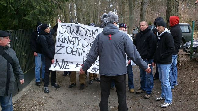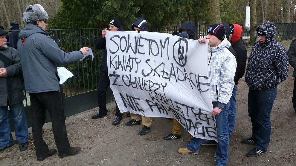 Młodzi ludzie stanęli przed cmentarzem z transparentem „Sowietom kwiaty składacie żołnierzy wyklętych nie pamiętacie”. Mieli ze sobą także ulotki, na których wyliczali polskie ofiary komunistycznego reżimu.