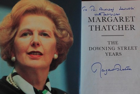 Mam ten zaszczyt, iż otrzymałem jeden egzemplarz tej książki dedykowany mi osobiście. Traktuje to jako docenienie moich skromnych działań w latach 1990 – 93 jako członka kierownictwa Ministerstwa Rynku Wewnętrznego oraz Przemysłu i Handlu odpowiedzialnego za restrukturyzację i demonopolizację handlu i politykę wobec small biznesu. Pamiętamy, (kto ten film oglądał) jak w filmie „Żelazna Dama”, grająca tę rolę Meryl Streep podpisała książkę przez pomyłkę, w zamyśleniu, nazwiskiem panieńskim Roberts. We wspomnianej książce M. Thatcher dwa razy odnosi się do wątku polskiego. Pierwszy raz to jej wizyta w 1988 r. Jej liczne spotkania z przedstawicielami władzy i z opozycją w Gdańsku miały znaczny wpływ na relacje polityczne w Polsce. Prowadząc rozmowę w hotelu w Gdańsku Pani Premier mówi do Wałęsy: „Musisz naprawdę zdawać sobie sprawę z tego, że rząd wszystko słyszy” a L. Wałęsa odpowiada patrząc na sufit: Nie ma sprawy nasze spotkania są podsłuchiwane”, drugi wątek to ważna sprawa stosunków polsko – niemieckich. Pni M. Thatcher pisze: „I wreszcie, po wielu naciskach, kanclerz Kohl zgodził się potwierdzić istniejącą między Niemcami a Polską granicę specjalnym traktatem podpisanym w listopadzie 1990r. Pełniąc funkcje premiera w latach 1979 – 1990 wykreowała liberalną politykę gospodarczą, którą nazwano „thatcheryzmem”.