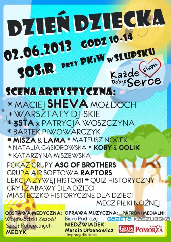 2 czerwca w Słupsku odbędzie się Dzień Dziecka organizowany przez grupę wolontariuszy Każde Dobre Serce Słupsk. Impreza odbędzie się w godz. 10.00 – 14.00 na terenie SOSIR – u w Parku Kultury i Wypoczynku w Słupsku. Czeka wiele atrakcji. Wstęp wolny.