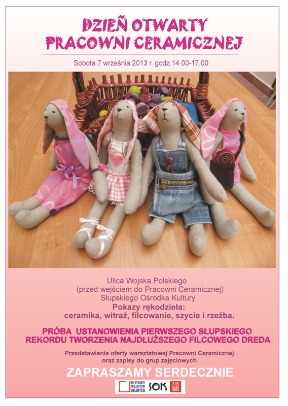 Rewelacyjnie zapowiada się Dzień Otwarty w Pracowni Ceramicznej, który odbędzie się w sobotę 7 września. Nie dość, że będzie można zobaczyć na żywo, niezwykle szeroką ofertę zajęć, które przygotowała Pracownia, to dodatkowo wszyscy uczestnicy staną się świadkami ustanowienia pierwszego słupskiego rekordu we wspólnym tworzeniu filcowego dreda.