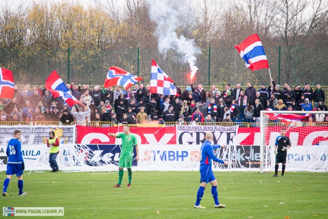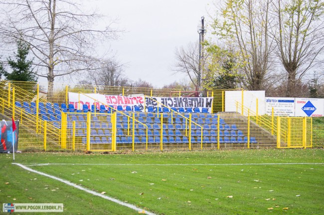 a w liczbie ok. 180, mogli tylko zza płotu nasłuchiwać, bo nie widzieć, tego, co działo się na murawie. Kibice Pogoni zachowywali się bez zarzutu. W drugiej połowie na stadionie wobec kibiców Gryfa interweniowała policja, a mecz był dwukrotnie przerwany.