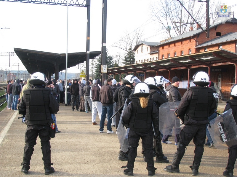 W niedzielę kilkudziesięciu policjantów z Lęborka i Oddziałów Prewencji Komendy Wojewódzkiej Policji w Gdańsku oraz funkcjonariusze Służby Ochrony Kolei zabezpieczali wyjazd i przejazd kibiców Pogoni Lębork na mecz derbowy w Słupsku. Policjanci legitymowali i sprawdzali, pod kątem niebezpiecznych przedmiotów i alkoholu, grupę ponad 110 kibiców lęborskiego klubu piłkarskiego, która zebrała się już przed godziną 10 przed dworcem PKS.