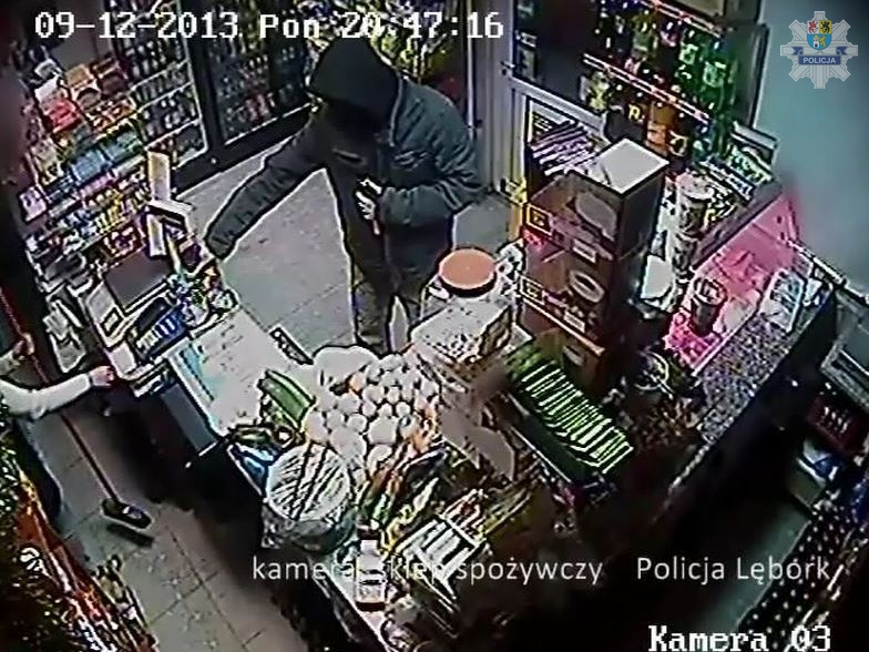 Do zdarzeń doszło w poniedziałek około godz. 16 i około 21 na terenie Lęborka. Mężczyzna szczupłej budowy ciała, wysoki (około 180 cm), ubrany w ciemną (granatową lub czarną) kurtkę, spodnie typu bojówki w kolorze jasno brązowym, popielatym, w kapturze i z kominiarką na twarzy wszedł najpierw do zakładów bukmacherskich na ul. Staromiejskiej. Potem prawdopodobnie ten sam mężczyzna wszedł do sklepu spożywczego przy ul. I Armii Wojska Polskiego. Po wejściu zażądał wydania pieniędzy i nie używając siły po otrzymaniu pieniędzy wyszedł w nieznanym kierunku. Jak wynika z zapisu monitoringu i zeznań świadków, mężczyzna miał przy sobie przedmiot przypominający toporek lub siekierę.