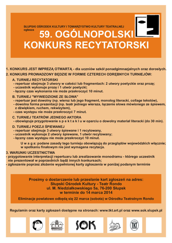 Eliminacje powiatowe konkursu odbędą się 22 marca (sobota) w Ośrodku Teatralnym Rondo. Zgłoszenia należy przesłać w terminie do 14 marca 2014 na adres: Słupski Ośrodek Kultury – Teatr Rondo, ul. Niedziałkowskiego 5a, 76-200 Słupsk.