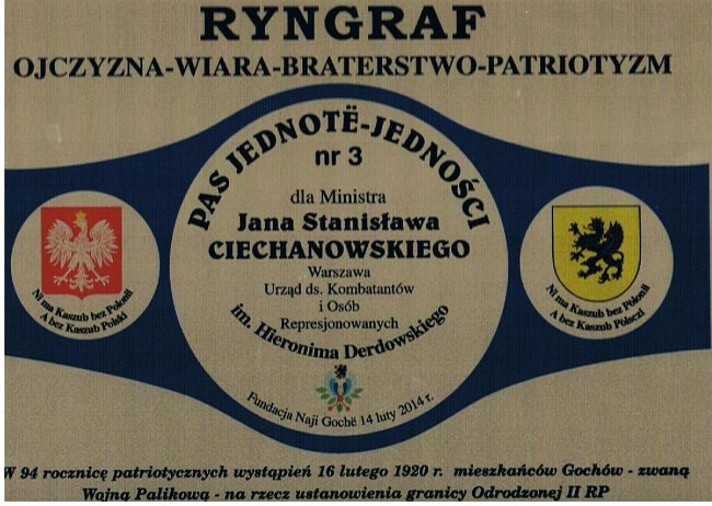 Nadając i proszą o przyjęcie tego wyróżnienia, wyrażamy także nasze skromne z serca płynące podziękowania za ciągłą życzliwość i wsparcie udzielane naszej Fundacji, w której działaniach towarzyszy głoszona przez Hieronima Derdowskiego – Kaszuba – Polaka, wielkiego duchem, sercem i patriotycznym czynem – poetę, literacka fraza, która o państwowo – narodowej idei jedności głosi, że