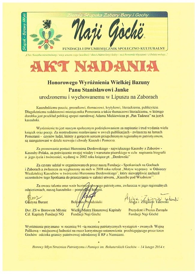Stanisław Janke z Wejherowa. Kaszubski poeta, prozaik, tłumacz, krytyk literacki, publicysta. Długoletni redaktor miesięcznika Pomerania a także tłumacz literacki, w którego dorobku jest przekład polskiej epopei narodowej Adama Mickiewicza Pt „Pan Tadeusz” na język kaszubski.