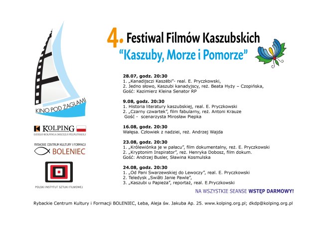 Każda projekcja filmu to wstęp darmowy, można jednak uiścić jakakolwiek opłatę( po projekcji) na rzecz „Kina pod żaglami „ – po prostu na jego funkcjonowanie! Warto.
