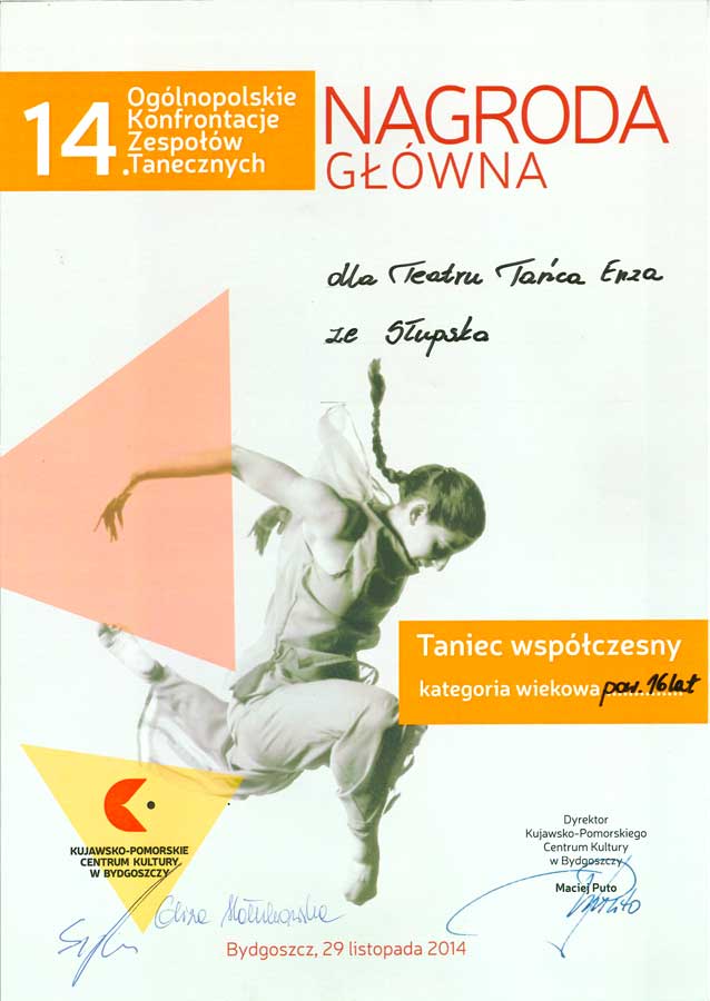 Radosne wieści przyszły do nas z Bydgoszczy. Teatr Tańca „Ezna”, pracujący w Teatrze Rondo pod opieką instruktorską Gabrieli Keller-Janus, zdobył Główną Nagrodę na 14. Ogólnopolskich Konfrontacjach Zespołów Tanecznych, organizowanych przez Kujawsko-Pomorskie Centrum Kultury w Bydgoszczy.