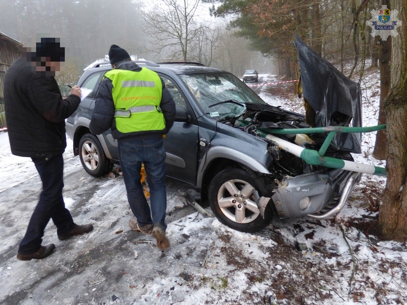 Policjanci z Lęborka wyjaśniają okoliczności tragicznego wypadku drogowego do jakiego doszło w Sylwestra. Kierowca toyoty z niewyjaśnionych przyczyn uderzył w leśny szlaban który wpił się do wnętrza pojazdu. Kierowca zginął na miejscu. Przez kilka godzin policjanci zabezpieczali miejsce wypadku.