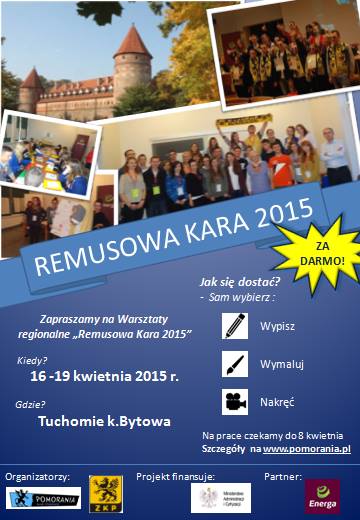 Klub Studencki Pomorania zaprasza kaszubską młodzież ze szkół ponadgimnazjalnych na kolejną edycję regionalnych warsztatów Remusowa Kara. Impreza ta odbędzie się w Tuchomiu koło Bytowa w dniach 16 – 19 kwietnia.