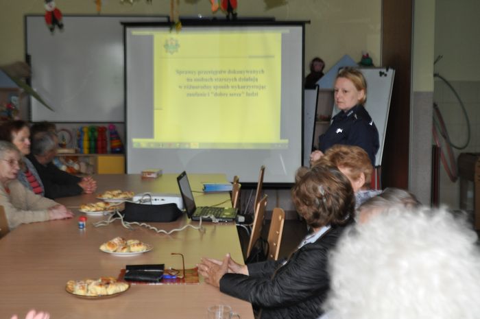 Policjanci już na samym początku spotkania zwrócili uwagę na przestępstwa, których dopuszczają się sprawcy na szkodę osób starszych oraz radzili jak postępować, aby nie stać się ofiarą oszustów i złodziei. Przygotowana specjalnie na to spotkanie prezentacja multimedialna, przedstawiała najważniejsze metody i sposoby, którymi posługują się sprawcy przestępstw popełnianych na szkodę osób starszych.