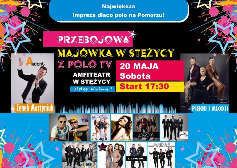 Otwarcie sezonu imprezowego w rytmie disco polo zapowiada się bardzo gorąco. Już 20 maja odbędzie się Przebojowa Majówka w Stężycy. W tamtejszym amfiteatrze zagrają takie gwiazdy muzyki tanecznej, jak: Akcent, Piękni i Młodzi, Andre, Boys, Classic, Long&Junior, Extazy, Exaited, Power Play, Top Girls, czy Jorgus.